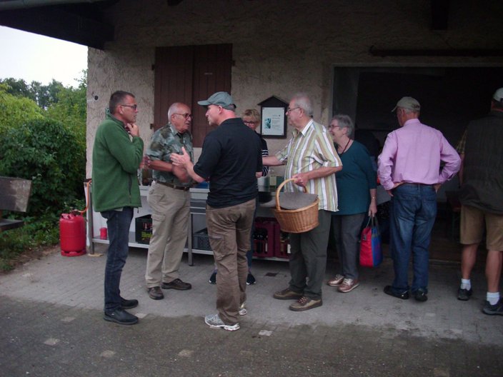 Auf Grund der unsicheren Wetterlage traf man sich wieder bei der Erwin-Vogt-Hütte in Erligheim. Kurz nachdem Grill und Garnituren aufgebaut waren, mussten die 25 Teilnehmer in die Hütte umziehen, denn ein kräftiger Regenschauer macht das Sitzen im Freien nicht möglich.