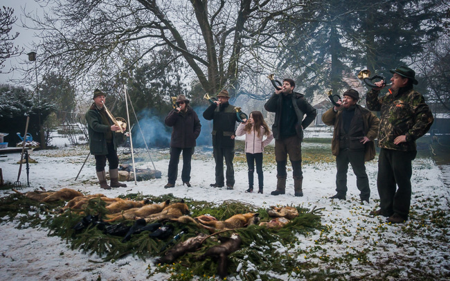 Insgesamt 11 Füchse, 2 Marder, 8 Krähen sowie 1 Elster lagen bei traumhafter Schneelage auf der Strecke. Diese wurde von den anwesenden Jagdhornbläsern brauchtumsgerecht verblasen.