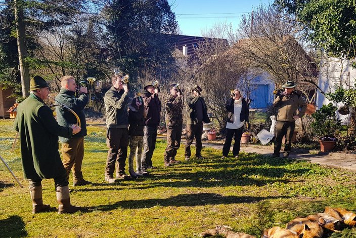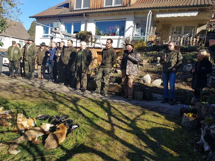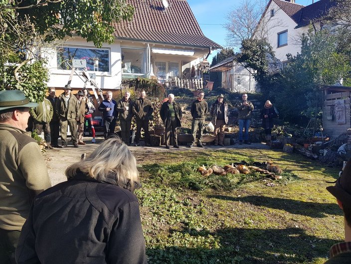 Am 24. Februar fand zum wiederholten Male das diesjährige Streckenlegen der Fuchswochen im Gebiet Stromberg und Vaihingen statt. Hegegemeinschaftsleiter Michael Müller hatte wieder in seinen Garten eingeladen. Ein Großteil der erlegten Füchse wurde bereits zur Fa. Fellwechsel abgegeben oder wegen der Staupe in Aurich und Vaihingen entsorgt. Bei herrlichstem Sonnenschein lagen trotzdem noch 6 Füchse, 5 Krähen und 1 Elstern auf der Strecke, die von den anwesenden Bläsern verblasen werden konnten.