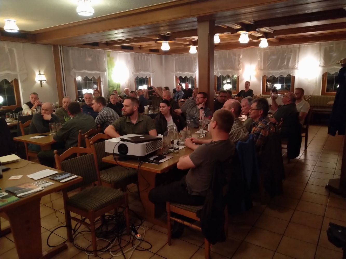 Nach der Totenehrung berichtete HRL Manfred Pache über die behandelten Themen an den Stammtischen und Veranstaltungen. Alle Infos wurden über Email-Rundschreiben an alle Jagenden verteilt. Nur noch zwei Jäger werden persönlich informiert. Hervorgehoben wurde die Aktivitäten zur Fasanen-Auswilderung, die Hegering übergreifend von Markus Eberle, Enzweihingen koordiniert und sehr erfolgreich betrieben wird. Dank an ihn und Hegegemeinschaftleiter Michael Müller für die tatkräftige Bewerbung der Prädatorenbejagung, so daß anlässlich der diesjährigen Arteinschutzwoche sehr hohe Abschusszahlen berichtet wurden.