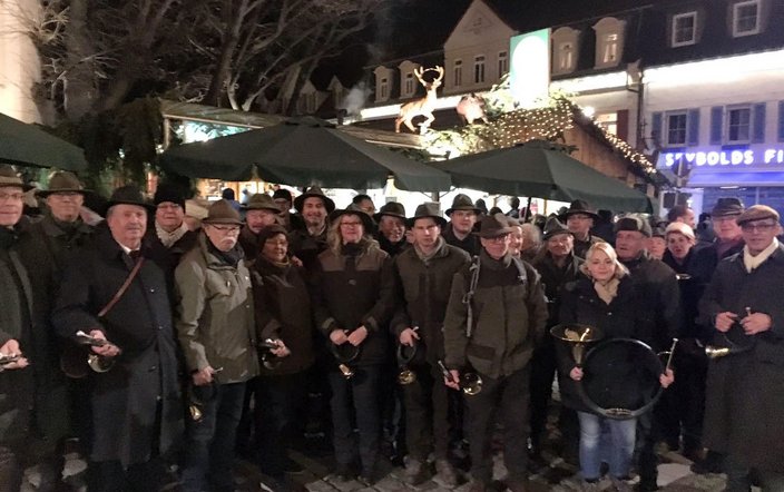 Der nun 3. Jägertreff stieß wieder auf großes Interesse und hohen Zulauf. Drei Stunden bliesen die Jagdhornbläser an Seybolds Wildererhütte auf dem Weihnachtsmarkt in Ludwigsburg.