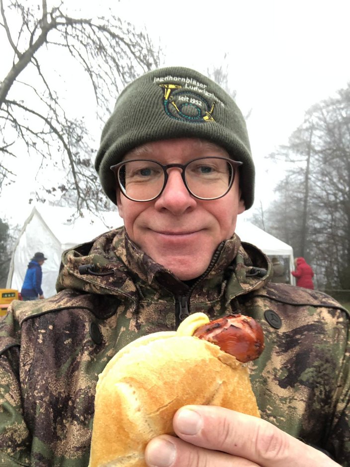 Die erste rote Wurst beim diesjährigen Silvesterblasen auf dem Fellbacher Kappelberg ging an niemand Geringeren als an einen unserer Bläser. Trotz des Nieselregens der anfänglich noch kurz herrschte war der Berg überaus gut besucht. Über 60 Fürst Pless- und Parforcehorn Bläser aus diversen Bläsergruppen eröffneten gemeinsam und klangvoll die Veranstaltung. Eine um die andere Bläsergruppe trug dann nacheinander eine kleine Auswahl ihres Repertoires vor. Wir Ludwigsburger waren mit 18 Bläsern die mann- und fraustarkste Truppe. Alphörner und mehrere Trompe de Chasse Bläser spielten ebenfalls auf.