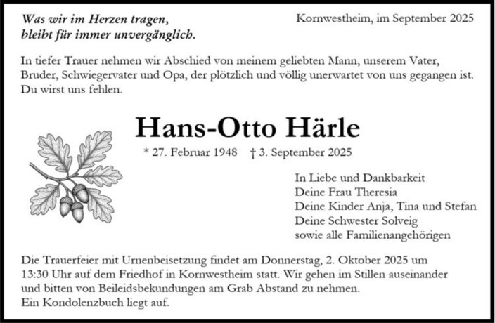 Wir trauern um Hans-Otto Härle, der am 3. September 2025 verstorben ist.