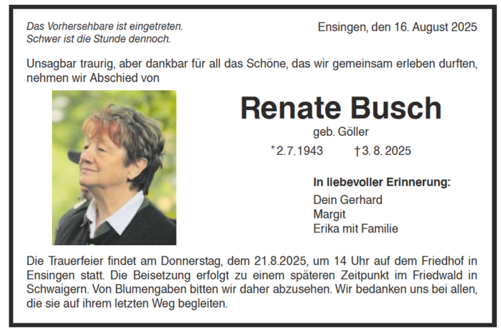 Die Trauerfeier findet auf dm Ensinger Friedhof am Donnerstag, den 21. 8. 2025 um 14 Uhr statt. (siehe Anhang)