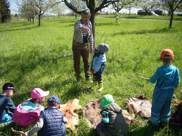 Im Rahmen einer Waldwoche, konnte W.Weiss mit über 20 Kindern bei schönem Sonnenschein und trockenem Wetter einen Ereignis-Rundgang durch den Wald machen und den Kindern neben Fegestellen, Hochsitz, Salzlecke, Trittsiegel von Reh und Sau sowie Fell und Deckenpräparate aller Tier, die auch im Wald vorkommen, zeigen. Begeistert waren die Kinder davon einmal eine Sauschwarte oder ein Fuchsfell zu streicheln.Als Zugabe erhielten die Kinder noch einige Präsente von „Lernort Natur“.