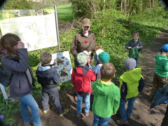 Es handelt sich um einen Baustein aus dem „Lernort Natur-Projekt“ der Jagdverbände, dessen Zielsetzung u.a. die spielerische Wissensvermittlung rund um die Wildtiere und deren Lebensräume „vor der Haustüre“ ist. So verwandelte sich am 19. April das Waldstück auf der Gemarkung „Brunnenhalde“ für 15 Grundschüler der 1. und 2. Klasse zum „grünen Schulhaus“ und der dortige Waldweg zum Wildtier-Parcours. Naturgetreue Präparate wurden in ihrem Lebensraum realitätsnah aufgestellt und auf einem gemeinsamen Pirschgang mit den Jägern sowie betreuenden Elternteilen „entdeckt“. Die Kinder konnten ihr teilweise erstaunliches Wissen zum Besten geben, viele darüber hinausgehende Details wurden im lebhaften Austausch miteinander erarbeitet. Anhand von Fellen, Geweihstangen, Federn oder auch Gebissen konnte auf die jeweiligen Besonderheiten der heimischen Tiere, deren Ernährungsverhalten, aber auch auf deren Gefährdung eingegangen werden. Abschließend zeigte Griffonhündin BIRKA, wie ein Jagdhund auf der Fährte des Wildes arbeitet und apportiert. Zum Ende der Veranstaltung erhielten alle Teilnehmer LernortNatur-Bestimmungsunterlagen und Stundenpläne mit Tierportraits - durchaus mit dem Hintergedanken versehen, dass auch die Eltern daheim einen Blick darauf riskieren dürfen. Denn auch in der Erwachsenenwelt hat sich noch nicht durchgehend herumgesprochen, dass der „Hirsch nicht der Mann vom Reh“ ist, sondern der Rehbock. Walt Dinsey’s BAMBI lässt freundlich grüßen!