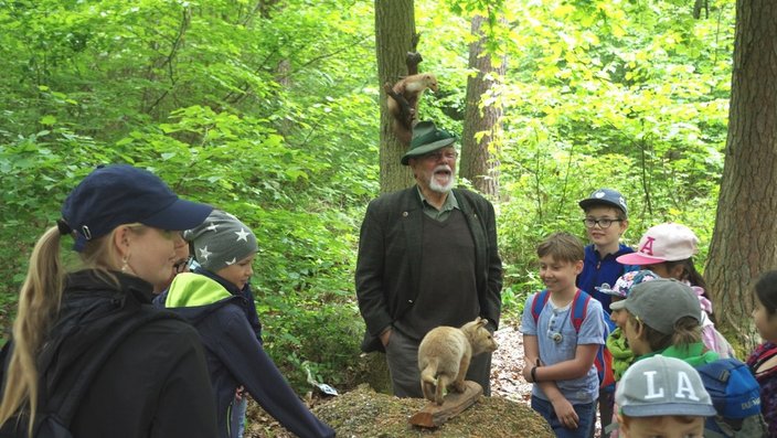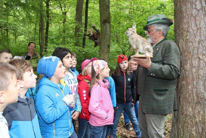 Gespannt machten sich 75 Kinder der Ganerbenschule am Donnerstag auf den Weg zur Florianshütte. Auf dem Lehrplan stand der „Lebensraum Wald“, den Bönnigheimer Jäger den Schülerinnen und Schülern an fünf Stationen nahe brachten. Die Präparate von Marder, Dachs, Fuchs, Hasen und Raben erläuterte Harald Dreißigacker, der viele Jahre lang in Ludwigsburg angehende Jäger ausgebildet hatte. „Dachse sind sehr soziale Wesen und lassen auch Füchse in ihrem Bau wohnen“, erklärte Dreißigacker den Schülern. Dass Wiesel auch zur Mäusejagd taugen, wussten viele nicht. Und dass Raben durchaus mal Jogger angreifen, wenn diese ihrem Nest zu nahe kommen. So wollte der Jäger wissen „Welche Krankheit wird durch den Fuchs übertragen.“ „Der Fuchsbandwurm“ wusste der neunjährige Hannes aus der dritten Klasse der Grundschule. Fälle der tödlichen Tollwut, so Dreißigacker, kämen dagegen im Land heute nicht mehr vor.