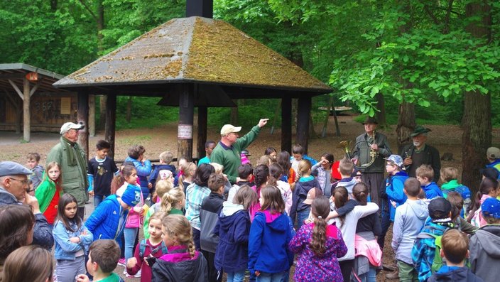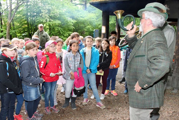„Sie haben sich total gefreut, es ist echt etwas Besonderes für sie“, sagte Lehrer Ulrich Eisele von der Ganerbenschule. Ein paar Wochen habe man sich auf diesen Tag vorbereitet, der auch im Lehrplan unter „Lebensraum Wald“ verankert ist. Viele Kinder gingen nicht so oft in den Wald und hätten nun Gelegenheit ihn zu erkunden, so der Bönnigheimer Lehrer. Vor allem die Jungs waren auf die Jäger gespannt und deshalb sehr motiviert. Dass sie keine Gewehre dabei hatten, sorgte nur kurz für Enttäuschung. Der lehrreiche Vormittag an der Florianhütte entschädigte dafür. Das stilechte Willkommen durch die Jäger gab es für die Kinder natürlich auch. Auf dem Jagdhorn bließen sie das Signal „Begrüßung“ und „Aufbruch zur Jagd“, nachdem es für sie in eine ihrer fünf Gruppen ging.