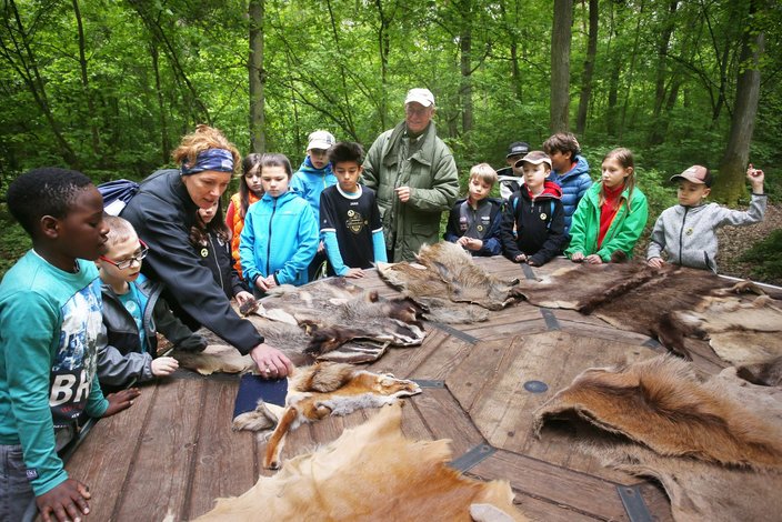 Tierfelle zum Ertasten und Erfühlen hatten die Jagdpächter mitgebracht. An einer weiteren Station erklärte Manja Grünenwald die Bäume des Waldes und ihr Holz. Dass Buchäckern bei Tieren sehr beliebt sind, erfuhren die Schüler ebenso wie die Bedeutung der Jahresringe im Holz. Auf einem Tisch konnten sie Schädel und Gebisse von Tieren begutachten und die Unterschiede feststellen. Zwei echte Jagdhunde auch waren zu bewundern: Falko und Leo von Jäger Stefan Ott, der vieles über seine gut abgerichteten Tiere zu berichten wusste. „Wir haben die Veranstaltung das letzte Mal vor drei Jahren gemacht“, sagte Jäger Matthias Grünenwald. Seine Jagdpacht bei Bönnigheim umfasst rund 1000 Hektar, wo er auch nachts auf Wildschweinjagd unterwegs ist. Es sei generell wichtig, dass man den Schülern etwas über Natur und Jagd vermittelt. Und dabei auch mit manch falschem Bild von den Jägern aufräume, was noch bei einigen im Kopf existiert. Ausgesucht hatten sich die Jäger wieder die dritten Klassen der Ganerbenschule, wo das Gelernte auch hängen bleibt und nicht gleich wieder vergessen wird.