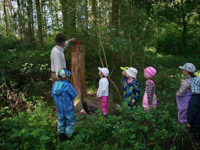 Jagdpächter Wilhelm Weiss freute sich sehr, dass er wieder mit 20 Kindern einen Rundgang durch den Wald machen und den Kindern vieles über über den Wald, Bäume heimisches Wild zeigen und erklären konnte.