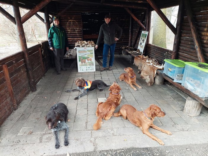 Die gemeinsame „Pirsch“ sollte ergänzend zum klassischen Schulunterricht einen naturnahen Einblick zu den winterlichen Lebensrhythmen des Wildes geben. Winteraktivität, Winterruhe, Winterschlaf oder das Überwintern der Zugvögel am Beispiel der Rotmilane, die aufgrund der Klimaveränderung immer öfter in hiesigen Bereichen verbleiben – eine Vielzahl von Themen wurden entlang des Präparateparcours angesprochen. Auch wenn der Winter sich an diesem Tag von seiner zwischenzeitlich gewohnt milden Seite zeigte, spannend war es für alle zwei- und vierbeinigen Teilnehmer allemal.